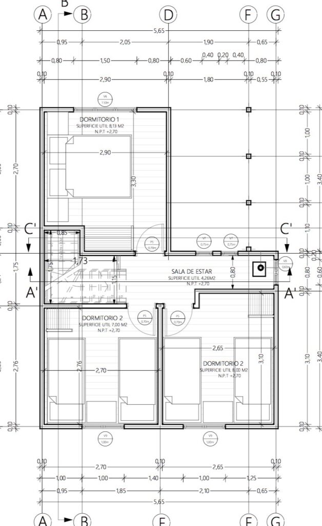 Plano de casa de 55 m² (7×9) con 2 dormitorios – DWG y PDF ¡Gratis!